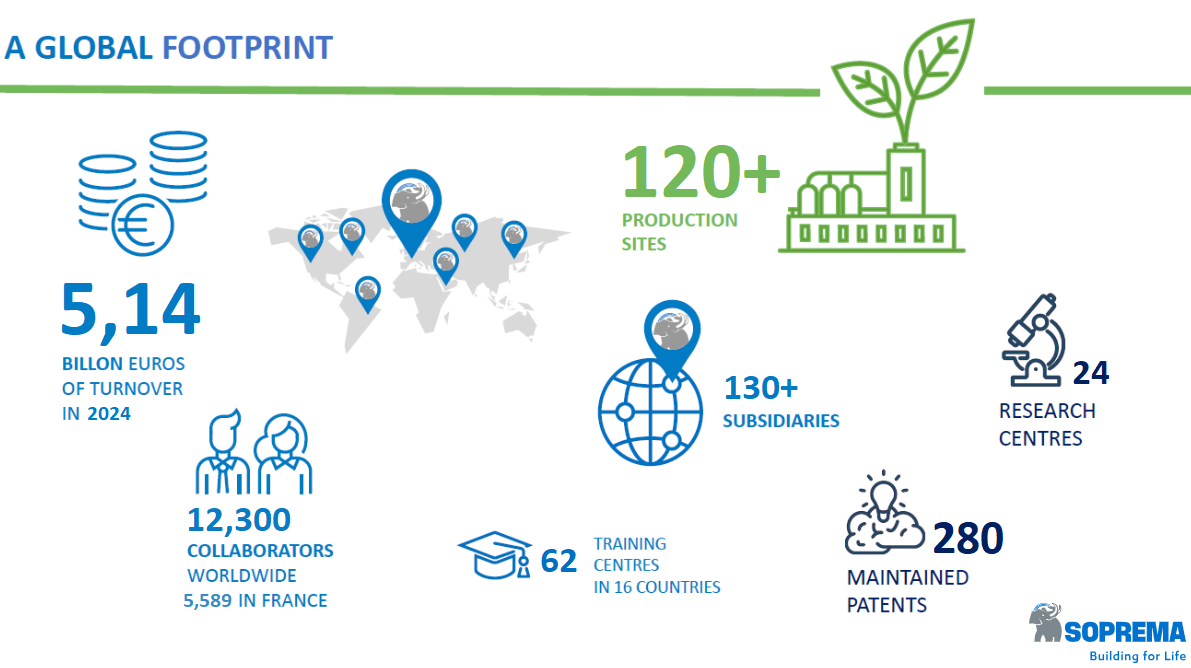 SOPREMA Group opublikowała główne dane dotyczące funkcjonowania firmy w 2024 roku w formie infografiki SOPREMA W LICZBACH. Firma zatrudnia ponad 1000 tyś. pracowników na całym świecie, a jej obrót skonsolidowany wyniósł 5,14 mld. euro.